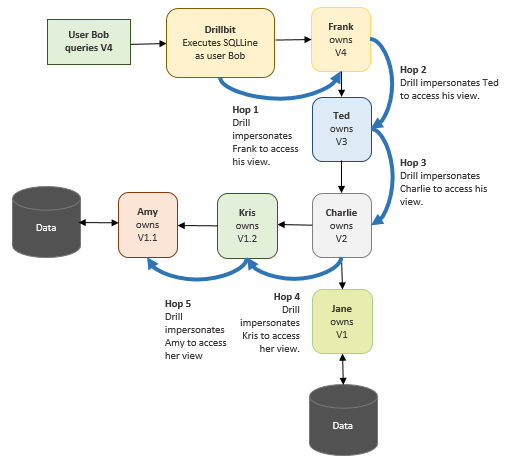 The following example depicts a scenario where the maximum hop number is set to 3, and Drill must impersonate three users to access data when Chad queries a view that Jane created: