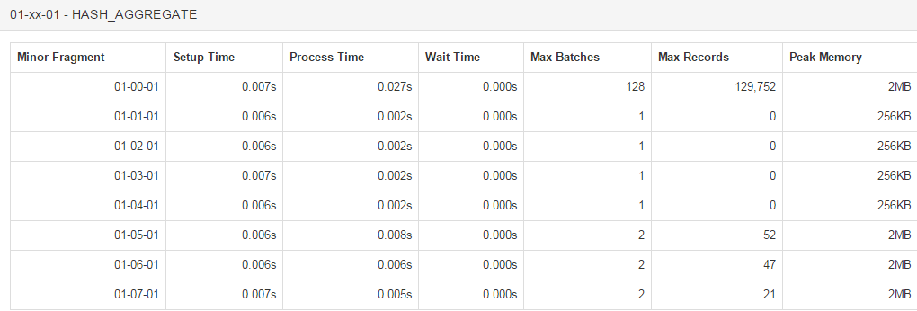Looking at the operator profile for the hash aggregate in major fragment 00, you can see that out of 8 minor fragments, only minor fragment 1 is processing a substantially larger number of records when compared to the other minor fragments.