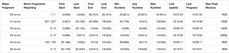 Fragment profiles provides an overview table and a major fragment block for each major fragment. Each row in the Overview table provides the number of minor fragments that Drill parallelized from each major fragment, as well as aggregate time and memory metrics for the minor fragments.