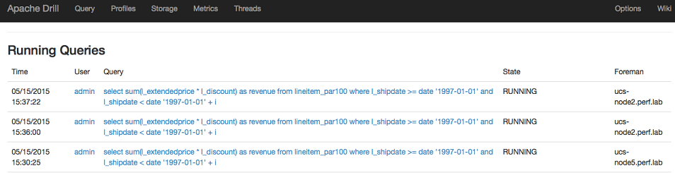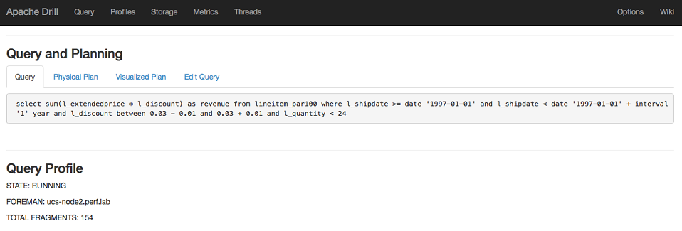 <drill_node_ip_address>:8047. The Drill node from which you access the Drill Web UI must have an active Drillbit running. - Select Profiles in the toolbar. A list of running and completed queries appears.