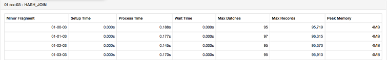 The Max Records number for each minor fragment should be almost equivalent. If one, or a very small number of minor fragments, perform the majority of the work, there may be data skew. To address data skew, you may need change settings related to table joins or partition data to balance the work.