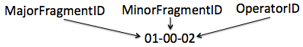 Metrics in a query profile are associated with a coordinate system of identifiers. Drill uses a coordinate system comprised of query, fragment, and operator identifiers to track query execution activities and resources. Drill assigns a unique identifier, the QueryID, to each query received and then assigns an identifier to each fragment and operator that executes the query. An example of a QueryID is 2aa98add-15b3-e155-5669-603c03bfde86. The following image shows an example of fragment and operator identifiers: