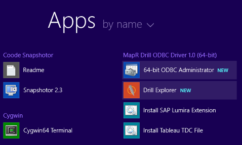 For example, on Windows 8.1 in Apps, the Install Tableau TDC File appears under MaprDrill ODBC Driver: