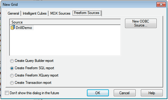4. Click the Freeform Soures tab, and select the Drill data source.