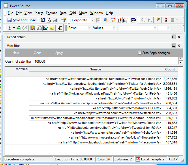 You can see that there are three major sources for the captured tweets. You can change the view to tabular format and apply a filter to see that iPhone, Android, and Web Client are the three major sources of tweets for this specific data set.