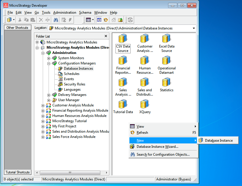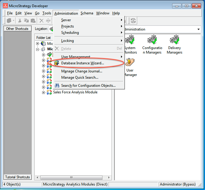 1. In MicroStrategy Developer, select Administration > Database Instance Wizard.