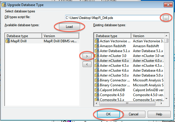 11. Click > to load MapR Drill into Existing database types.